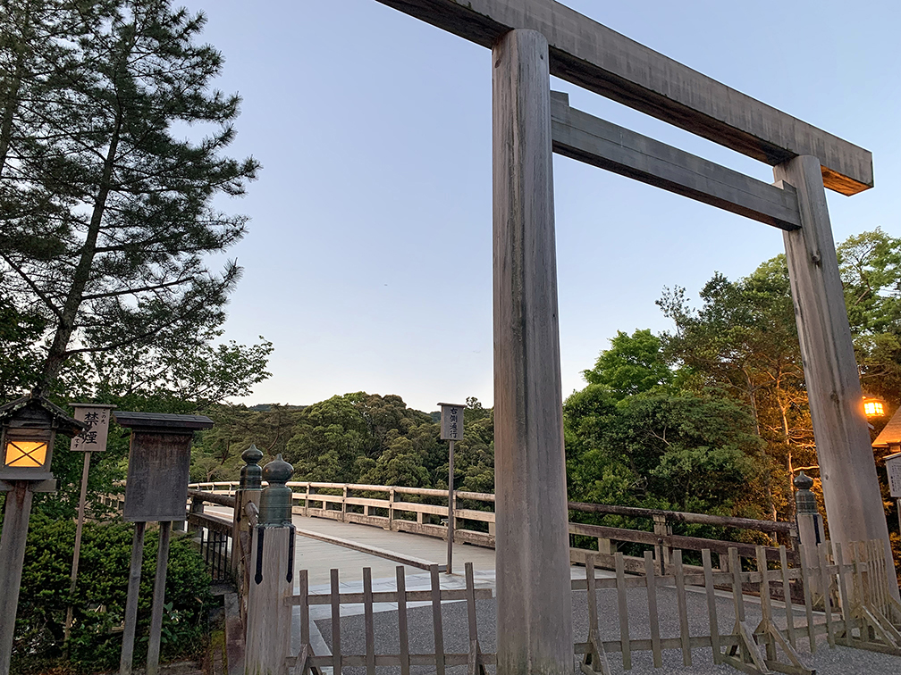正面に立つ大鳥居の前で日の出を眺めながら、参拝開始時間の午前5時に宇治橋を渡りました。