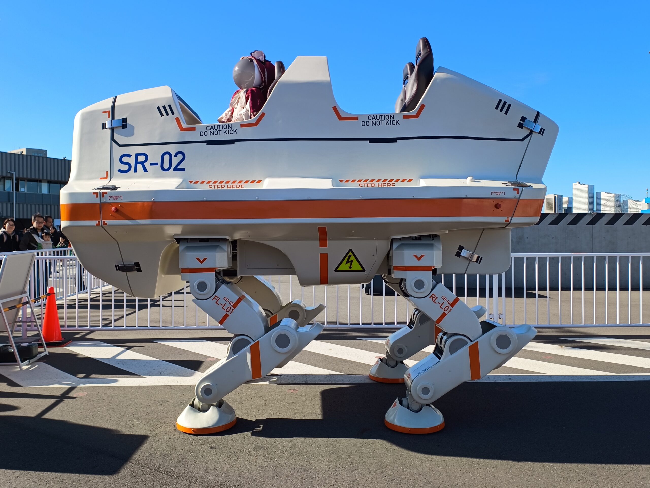 この日はSR-02の動態展示も。事前に興味はほとんどなかった四足歩行型のライド。見ているうちに動物味を感じて、かわいいじゃない?と解説を興味深く聞くことに。全長約3.4メートル、全幅約1.6メートル、全高約2.7メートルとなっており、4人が搭乗した状態での歩行移動が可能。歩行(前進/後退/右左折)をはじめ、人が乗降するための屈伸動作、ローリング、ピッチングなどさまざまな動きが可能とのこと。これはプロトタイプだそうなので、いつかアミューズメントパークにお目見えするかもしれない。